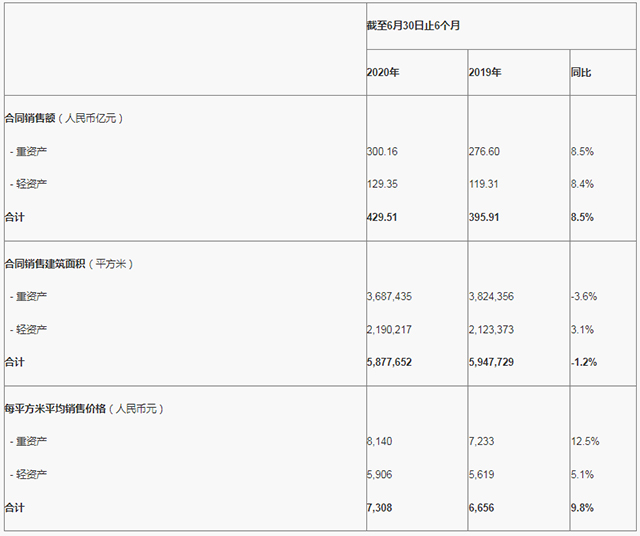 單月計(jì)算,二零二零年六月份,本集團(tuán)取得物業(yè)合同銷售額人民幣135.77億元,同比減少0.9%,合同銷售建筑面積1,826,922平方米,同比減少9.2%。二零二零年六月份之重資產(chǎn)每平方米平均銷售價(jià)格為人民幣8,466元,同比增加22.3%。