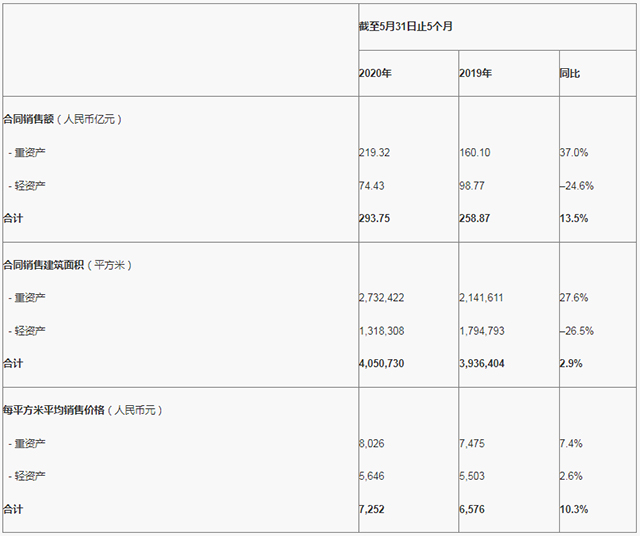 單月計(jì)算,二零二零年五月份,本集團(tuán)取得物業(yè)合同銷(xiāo)售額人民幣84.04億元,同比增加18.1%,合同銷(xiāo)售建筑面積1,113,234平方米,同比增加3.8%。二零二零年五月份之重資產(chǎn)每平方米平均銷(xiāo)售價(jià)格為人民幣8,855元,同比增加20.6%。